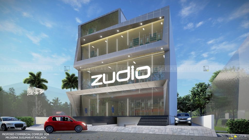 This commercial space is designed for Zudio with a basement parking space and G+2 floors for showroom. The Zudio brand has its own standard preference of interior layout so the main focus was on the façade design where the shape of the alphabet ‘Z’ is implicated through the projections of the elevation features.